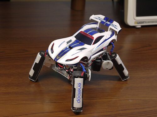 ミニ四駆ラジコン5号機は「ミニ四足」というコンセプトでいきます。 メカは5年ほど前に作ったPETロボのものを転用します。共立電子のプチロボを参考にして作ったメカです。ブラケットは自作ですが、サーボは当時のプチロボと同じものです。このサーボRB-001(…