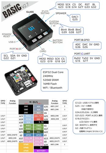 チートシート作った。 PDFはこちら → M5StackBasic_Pinout.pdf 出典 参考